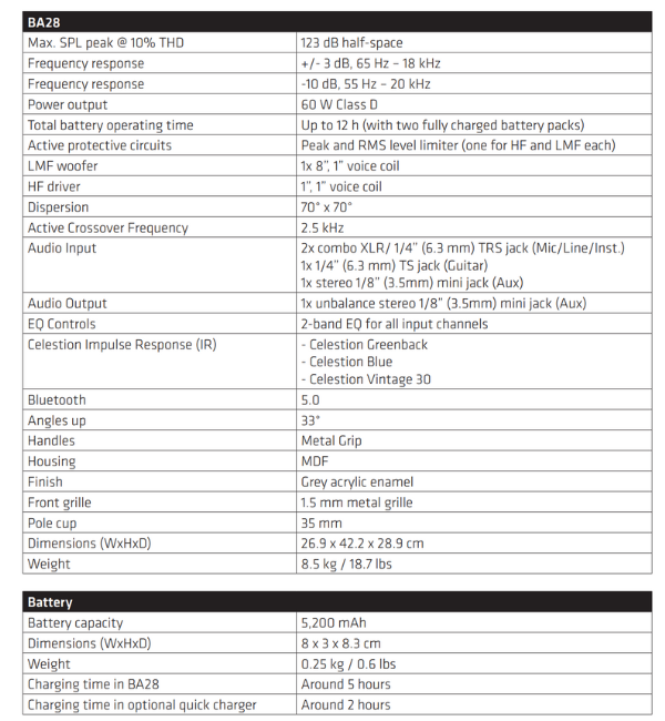 - 配備4個配有內置數碼調音台的輸入:Mic/Inst (1+2)、結他、藍牙/AUX和1個立體聲3.5毫米AUX輸出。BA28能靈活地用於不同場景。